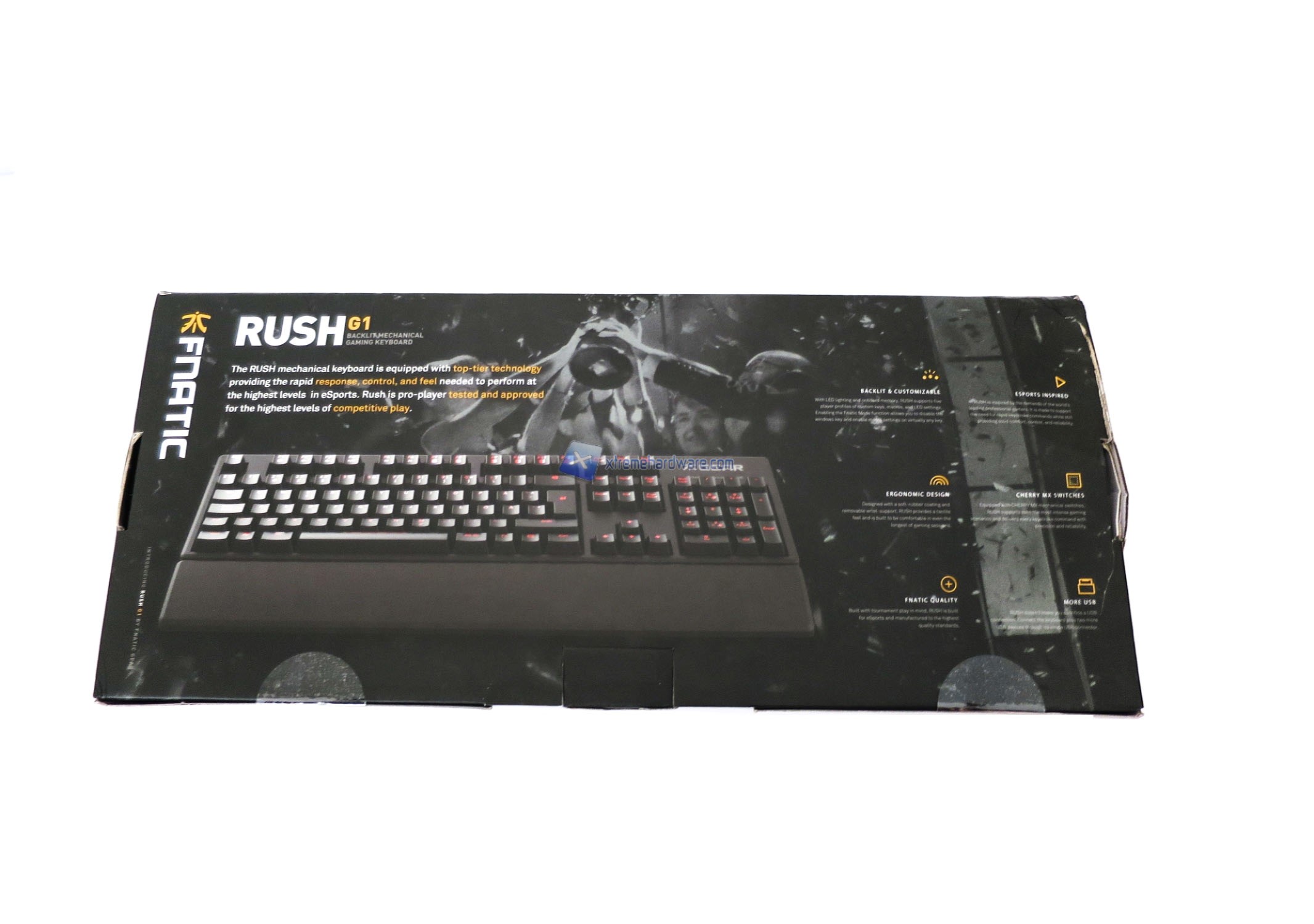 La confezione che ospita la tastiera RUSH è classica, di cartone con una grafica e design semplice ed immediato. Nella parte frontale troviamo un’immagine illustrativa del prodotto con i relativi riferimenti mentre nel retro troviamo le caratteristiche principali con la classica e breve descrizione.