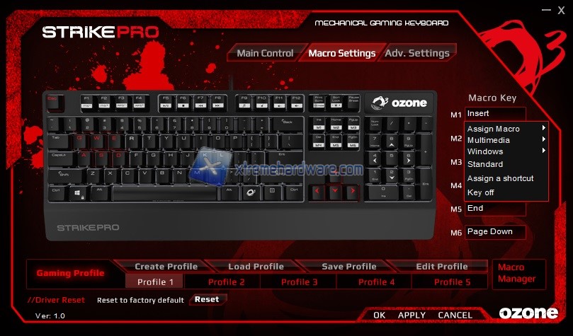 Spostandoci nel Menù ‘’Macro Settings’’ potremo finalmente agire sui 6 tasti Macro dedicati presenti sulla Strike Pro. Complessivamente potremo salvare fino a 30 combinazioni grazie ai 5 Profili Generali disponibili. Inutile dire che starà a voi scegliere come meglio assegnare funzioni o Macro a questi 6 tasti e in questi 5 Profili disponibili.