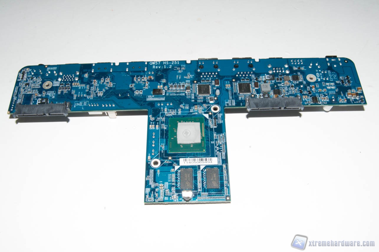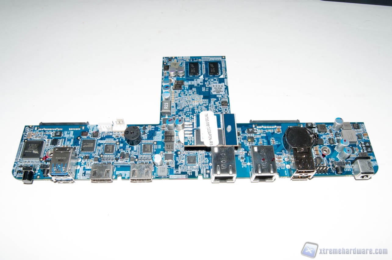 Girando la scheda notiamo il processore Intel Celeron coperto da gomma termo-conduttiva, due chip di RAM da 512MB ciascuno e i connettori SATA.